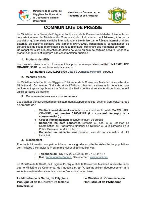 Le Ministère de la Santé, de l’Hygiène Publique et de la Couverture Maladie Universelle (MSHPCMU), en collaboration avec le Ministère du Commerce, de l’Industrie et de l’Artisanat, informe la population qu’une alerte sanitaire internationale a été émise par le Réseau international des autorités de sécurité sanitaire des aliments (INFOSAN). Cette alerte concerne la contamination de certains lots de marmelade d’oranges, en raison de la présence de débris de verre dans les produits.